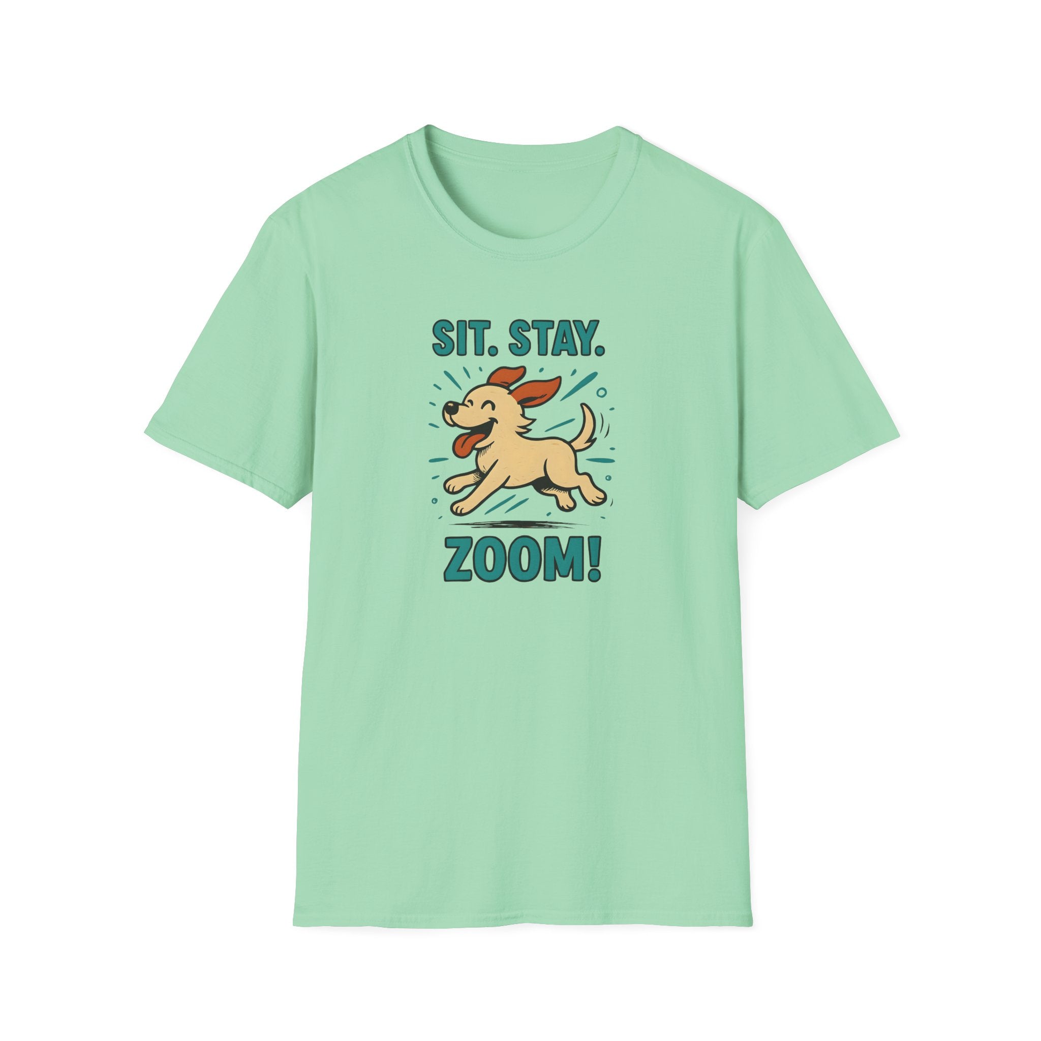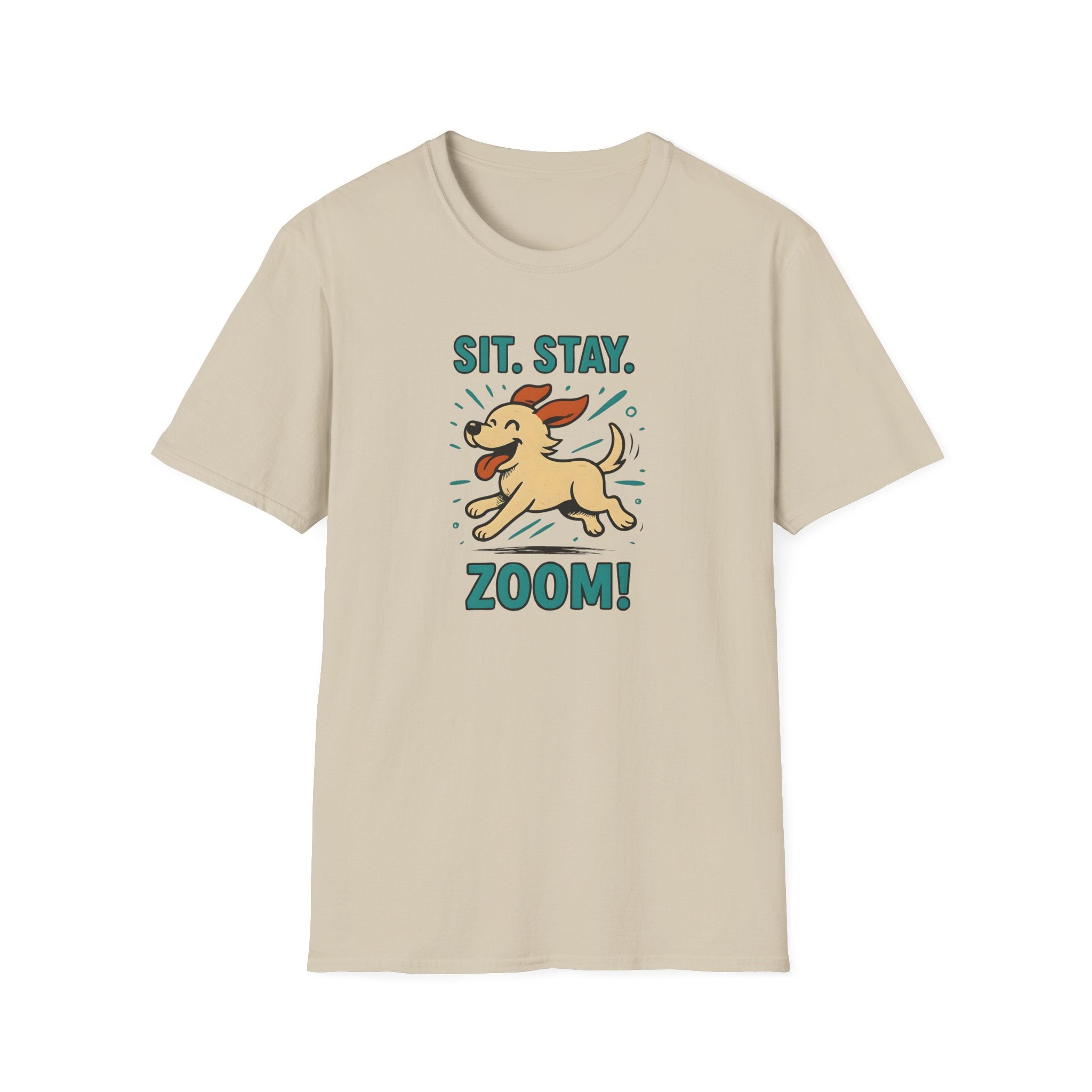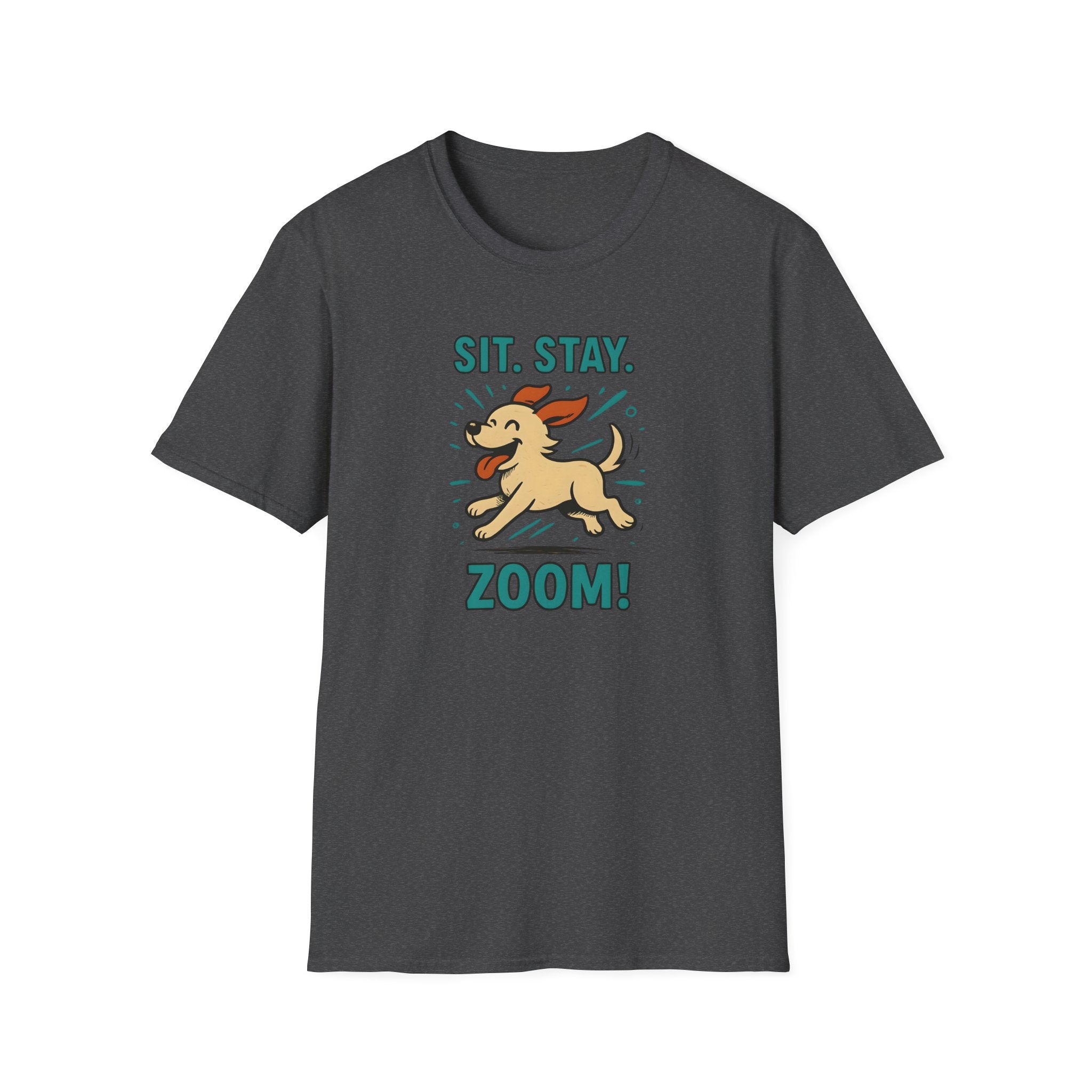 Sit. Stay. Zoom. T-Shirt. Introducing the perfect addition to your casual wardrobe: a Unisex Softstyle T-Shirt that balances comfort and style effortlessly. Made with lightweight, ring-spun cotton, this tee feels incredibly soft against the skin, making it an ideal choice for year-round wear. Its classic fit and crew neckline ensure versatility, allowing you to dress it up or down for any occasion. Whether you're lounging at home, heading out for a casual meetup, or attending a dog park event, this shirt fits seamlessly into your everyday life.